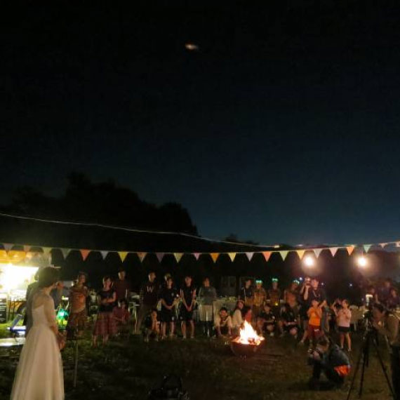 ピザ職人さんが畑で焼く本格ピザと、漁師さんが焼く魚介類。ドラム缶でバームクーヘンだって焼いちゃいます。宮川酒店のビールサーバーを背負った新郎がお客様の席を回ります。夜を迎えて二次会が始まり、キッチンカーからはカレーの匂いが溢れ出します。新郎新婦の「たのしもう」と多くの方々の「おめでとう」が畑で爆発した奇跡のような一日でした。そんなハレの日に彩りを添えられた心に残るお仕事でした。お二人ともお幸せに!